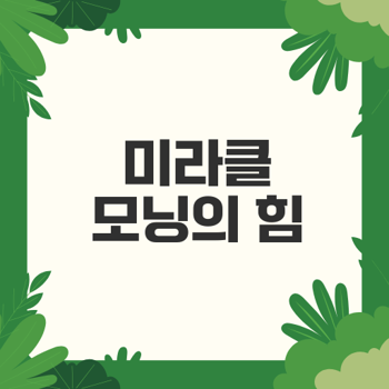 미라클 모닝은 아침 시간을 극대화하여 긍정적인 변화를 추구하는 강력한 방법론입니다. 이 루틴을 통해 정신적, 신체적 건강을 증진시키고 목표를 이룰 수 있습니다.≡ 목차 미라클 모닝의 정의와 기원 미라클 모닝이란 무엇인가 할 엘로드의 경험과 모티베이션 미라클 모닝의 구조와 운영 원칙 미라클 모닝의 효과 정신적 안정 및 집중력 향상 신체적 건강과 운동의 중요성 효율적 목표 설정과 성취 미라클 모닝 루틴 구성하기 아침 루틴의 필수 요소 개인 맞춤형 루틴 설계 지속적인 루틴 실행 방법 미라클 모닝을 통한 성공 사례 성공적인 CEO와 개인 블로거들 커뮤니티 반응과 긍정적 변화 실제 체험 이야기로 배운 점 같이보면 좋은 정보글! 미라클 모닝 효과로 삶을 바꾸는 방법 미라클 모닝으로..